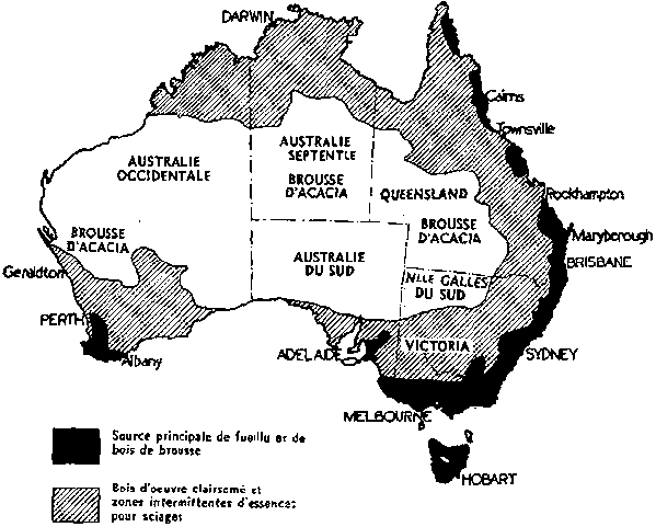 Les bois résineux ou à texture serrée d'origine locale sont très peu nombreux. Même en tenant compte du récent développement des plantations de pins exotiques qui couvrent aujourd'hui 61.000 ha environ, la quantité de résineux dont on dispose est tout à fait insuffisante pour satisfaire la demande en dehors de l'industrie de la pâte de bois. On s'est en conséquence rendu compte depuis longtemps que la principale condition à l'établissement de l'industrie du papier en Australie serait l'utilisation des bois feuillus et en particulier de l'eucalyptus.