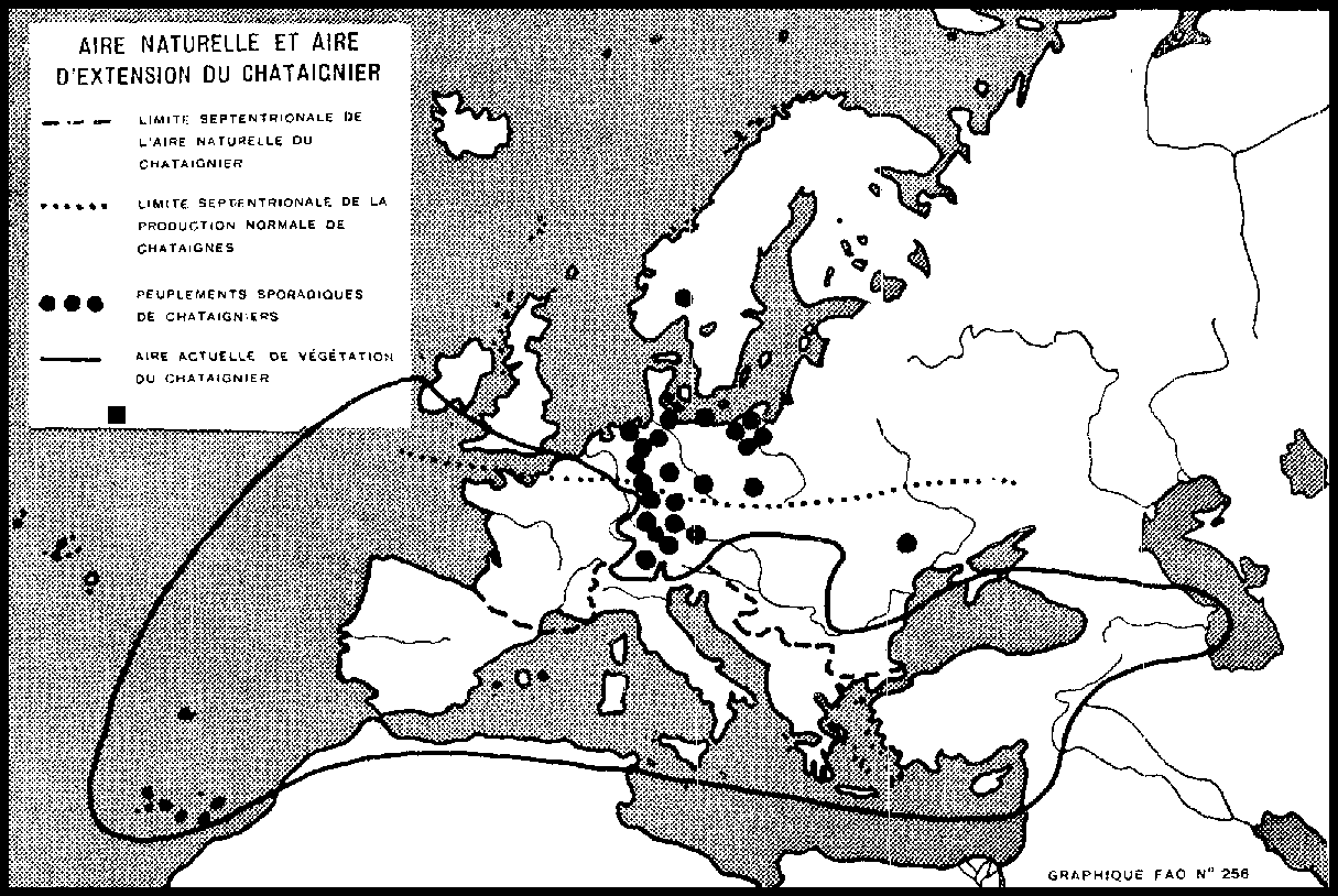 En France, si l'on se reporte aux Statistiques agricoles annuelles pour 1945, les arbres porteurs de fruits couvraient alors une superficie de 169.714 hectares et produisaient 110.562 tonnes de châtaignes. Ici aussi, les rapports signalent que la maladie de l'encre a très sérieusement attaqué les châtaigniers. C'est la Corse qui, avec 30.000 hectares, contient la plus vaste superficie de châtaigneraies productives.