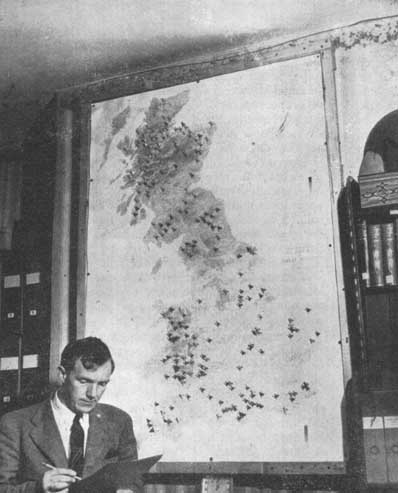 The work is divided into the following sections - Silviculture, Mensuration, Entomology, Pathology, Ecology, and Genetics, each of which, with the exception of silviculture, is headed by an officer responsible directly to the Chief Research Officer. In silviculture, it has been necessary to divide the country on a geographical basis and make one officer responsible for the work in the southern half of Great Britain and: one (working from Edinburgh) responsible for Scotland and the north of England. This division accords reasonably well with the distribution of the types of problems which have to be faced in afforestation.