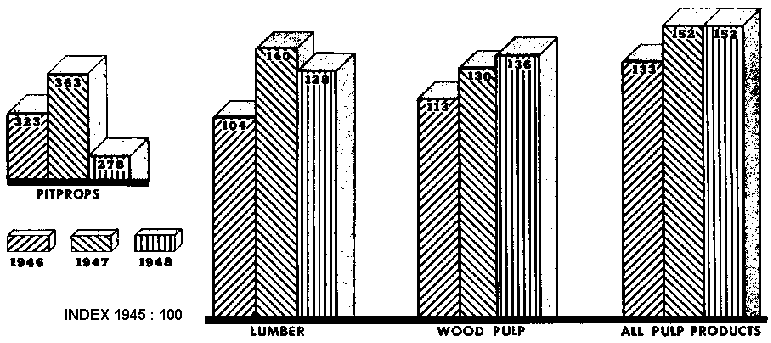 The volume of exports reported for 1948 is 17.6 million m³(s) (3.8 million standards), of which 15.8 million m³(s) or 3.4 million standards were coniferous (softwood) lumber. The volume reported for 1947 was 18.7 million m³(s) (4.0 million standards).