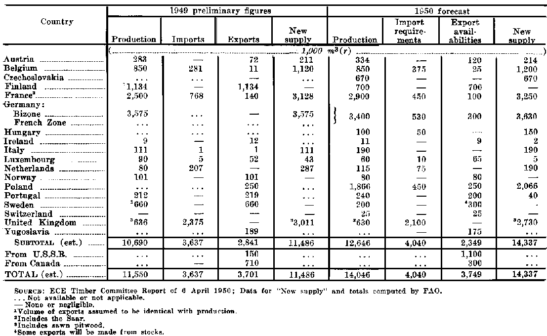 These two countries have announced 1950 export availabilities of 1,000,000 m³, viz., Finland 700,000 and Sweden an estimated 300,000 m³. These quantities, however, are likely to be considerably exceeded provided that contracts can be placed with consumer countries. The United Kingdom could take up 525,000 m³ of the Finnish export availabilities and more than the total Swedish forecast.