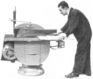 AUTOMATIC SAW SHARPENER. - In this machine, a motor above the grinding wheel head drives grinding wheel by means of short V-belt and a flange motor at rear drives both built-in dust extraction fan and feed mechanism. Specifications: Motor for grinding wheel, ¼ h.p.; flange motor, 1 h.p. Weight approx. 6 ½ cwt.; capacity: sharpens circular saws from approx. 4 ¾ inch to 40 inch diameter, and of 1 inch to 2 3/8 inch bore. Latest type is fitted for 2 speeds, 32 and 65 teeth per minute, and with adjustment by lever for three different profiles of teeth.