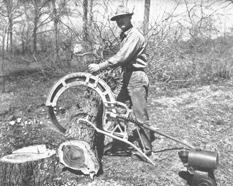 Esta sierra, que puede trabajar en cualquier posición, está ideada para cortar árboles y ramas gruesas, tronzar troncos, cortar maderos para duelas y leña y desmontar terrenos. La hoja está accionada por un árbol de transmisión flexible, al que va acoplado un mecanismo de fricción; funciona mediante la presión ejercida en el asa de la parte superior de la armazón, y al mismo tiempo dicha presión hace penetrar la sierra en la madera. La hoja gira a unas 300 r.p.m., y el mecanismo de fricción actúa sobre el borde exterior; de esta manera se consigue un corte rápido con poco gasto de fuerza. Características: hoja de 76,2 cm. (30"). calibre 15; poso de la sierra, 11,8 Kg. (26 libras); peso del motor, 11,3 a 19 Kg. (25 a 42 libras). Se pueden suministrar hojas de 50,8 ó 76,2 cm. (20" ó 30") de diámetro, y motor de 2,2 ó 3,6 HP, enfriado por aire.