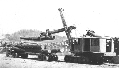 Las mordazas pueden adaptarse a la parte interior o exterior del brazo de cucharón de palas mecánicas de cualquier tipo o tamaño. Tres garras de acero situadas en la parte inferior interna de cada mordaza sirven para afianzar la troza en posición correcta. El material auxiliar necesario para el funcionamiento de la mordaza consta de un compresor de 0,8 m.3 (30 pies cúbicos), que suministra aire a una presión de 45-68 Kg. (100-150 libras). De ordinario, se monta un tanque de aire de 50 X 122 cm. (20" X 48"), con un sistema de tuberías para situar la válvula de mando en posición cómoda para el operario. Si el brazo del cucharón es hueco, se instalan los tubos en su interior, conectándolos a la manguera que por uno de sus extremos va a la válvula de accionamiento, y por el otro hasta un cilindro de aire de dos vías montado en las mordazas. El extensor o adaptador se monta fácilmente en los brazos del cucharón, y puede des. montarse con la misma facilidad cuando tenga que volver a ponerse el cucharón para excavaciones. Su longitud varia de 1,2 a 1,8 m. (4' a 6') según el tamaño de la pala mecánica.