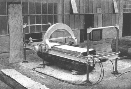 La bancada, que tiene un bastidor rígido montado en cuatro soportes, puede desmontarse fácilmente. Peso total, 90 Kg. El motor y la unidad de corte están sujetos a un soporte curvo que se mueve en sentido longitudinal, efectuándose la elevación y el descenso por medio de un cabrestante especial. Características: Motor refrigerado por aire, C.A. bifásica o trifásica, 110/190 ó 220/380 V., 50 ciclos, 2.800 r.p.m., 14-16 HP. Longitud de la bancada, 5 a 8,5 m., que permite cortes máximos de 3 a 4,5 m. respectivamente, ancho de la bancada, 1,5 m., siendo más o menos de 1,40 m. la anchura máxima del corte. Velocidad media de corte, 5-10 min./m.2 según la calidad y grado de humedad de la madera.