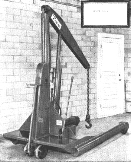 Esta grúa se construye en 6 modelos con capacidad de 1, 2 y 3 toneladas. El modelo normal de 1 tonelada tiene una amplitud de elevación de 3 m. (9'7") desde el nivel del suelo. El modelo de 1 tonelada para motor de autobús tiene un margen de elevación de 2,5 m. (8' - 4"); los modelos normales de 2 y 3 toneladas levantan la carga hasta 3,8 metros (10'-5"). Estas grúas solamente tienen dos mandos para su funcionamiento: palanca de la bomba para elevar la carga y válvula de descarga para el descenso.