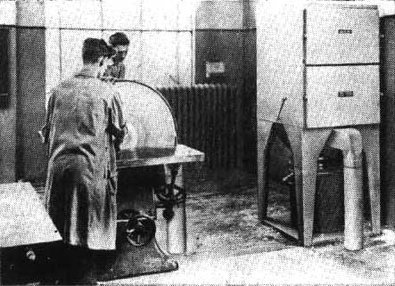 Se consigue un fácil acceso al ventilator, al motor y al filtro por medio de dos escotillas grandes. El «Dustmaster» está provisto de un colector de vaciamiento rápido para sacar el polvo, cuyo tamaño varía según la densidad de éste, y con asas para vaciarlo sin esparcir el contenido. Capacidad del ventilator: de 5 a 57 m.3/min. (175-2.000 pies cúbicos por minuto), accionado por motores de 1/3 a 2 ½ HP.