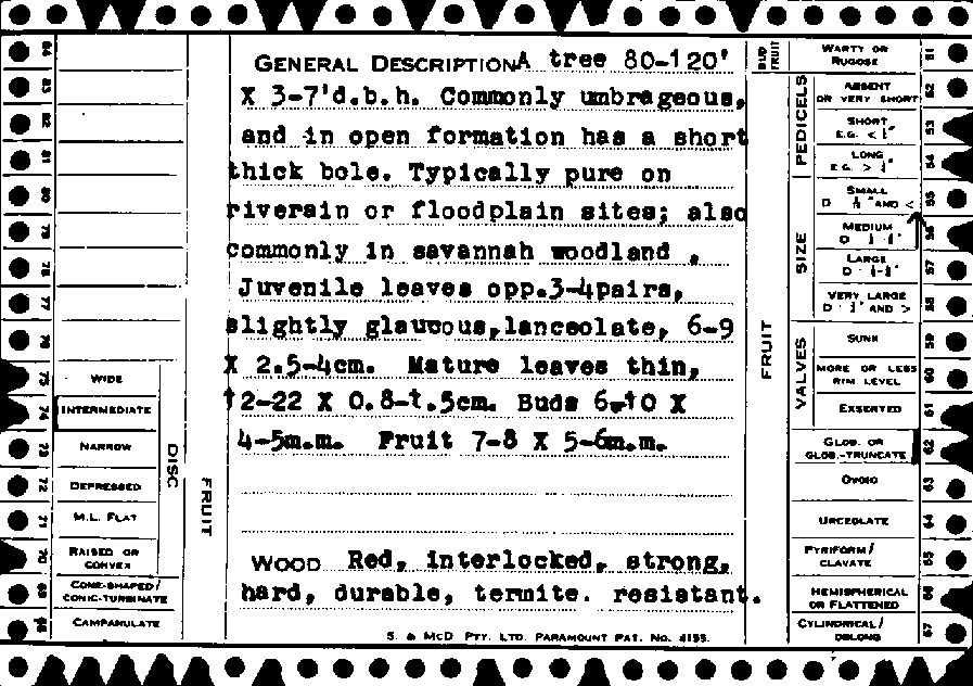 In the same manner in which wood anatomists found that photographs illustrating wood structure were needed on the wood sorting cards, it was found that illustrations of the fruits and buds on these cards were extremely helpful. These have been based on specimens figured by Maiden (10) and produced in a form suitable for use on the cards.