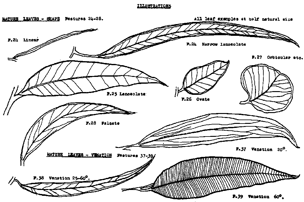 Definitions of the features used and notes on the technique of sorting have been prepared, as an aid to users of the key. As far as possible the conventional botanical meanings of terms have been used but in some cases it has been necessary to use a modified interpretation of a term, e.g. a narrow lanceolate leaf has been arbitrarily defined as one in which the ratio of length to breadth of a typical mature leaf exceeds 10:1. Some of the terms used, especially those relating to shape of the fruit, are not so readily adapted to definition in words and a plate has been prepared to illustrate features 24-28, 37-39 and 47-75.