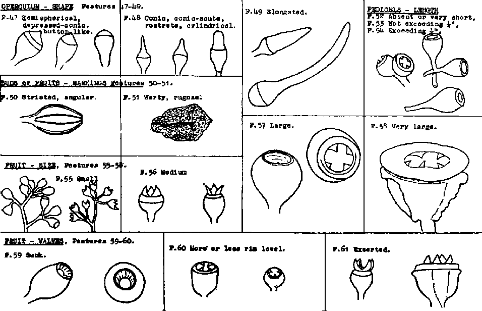 The following is a summary of notes on the group of features used in sorting. Illustrations of features 24-28, 37-39 and 47-75 are given on pages 2-4.Geographical distribution, 1-12. Cheek that species is native to a state and not introduced. Species commonly met include E. ficifolis, cladocalyx and citriodora.