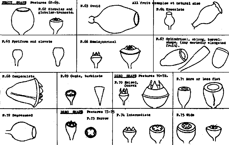 Fruit, shape, 62-69. Most species show a range in shape so that it is the exception for any one species to be coded on one shape only. Some species do not fit exactly into any of the eight shape. groups given but must be sorted on closest shapes. In most cases do not sort on shape until the final stages, unless the shape is quite distinctive, e.g., F. 64 for E. urnigers. etc.
