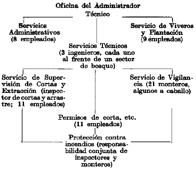L'ingénieur forestier qui assure la direction de l'Unidad est nommé, logé et payé par la compagnie industrielle, mais reçoit ses directives du Service forestier de l'état. Il reste fonctionnaire civil et le soutien du Service forestier national lui donne l'autorité morale de s'opposer à toute pression qui serait contraire aux intérêts nationaux. Le plan d'aménagement qu'il établi pour l'Unidad doit être approuvé par le Service forestier. On sait combien, pour les forêts tropicales notamment, l'établissement d'un plan précis et détaillé présente de difficultés et qu'il est non moins difficile de l'appliquer correctement. Ceci suppose donc un organisme de contrôle, intelligent et techniquement compétent, exerçant ce contrôle directement sur le terrain de sorte que l'institution des Unidades ne supprime pas, bien au contraire, la nécessité d'un Service forestier officiel. Elle peut en réduire l'effectif émargeant au budget de l'état, mais elle en augmente la puissance.