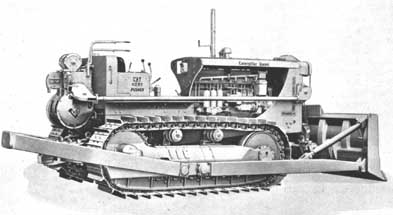D8 PUSHER TRACTOR. - A modified version of the D8 tractor adapted to and specifically equipped for pusher loading work has been developed to allow the heap loading of large scrapers. Specifications: D1 3000 engine has been modified to produce 150 drawbar-horse-power at 1200 r.p.m.; weight increased to 50,000 lb. (23,000 kg.) for better pusher balance and increased traction and includes as standard equipment a special heavy weight crankcase guard and track roller guards; bulldozer and gable controls for inline pushing action and glean up of out, new transmission for the most suitable pushing speed and oil-type clutches, tandem pusher frame attachment permitting the transfer of power from one tractor to another through the track roller frame thus avoiding the highly destructive stresses imposed on the leading tractor's final drive.