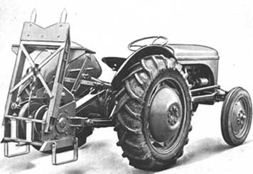 FERGUSON WINCH. - This winch for attachment to a tractor, has a positive drive by universal jointed shaft through a totally enclosed oil bath lubricated worm and worm-wheel to the gable drum. Specifications: pull: 7000 lb. (3,200 kg.); mounting: rear mounted by three point linkage, drive: by power take off; clutch: by hand lever; rope speed: 50 ft. (15 m.) per minute at 1500 engine r.p.m., standard rope 40 ft. (12 m.) with 100 ft. (30 m.) capacity. Dimensions: height: 55 in. (140 cm.); length: 48 in. (122 cm.); width: 32 in. (81 cm.); weight: approx. 670 lb. (300 kg.).