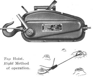 TIRFOR HOIST. - Designed for tree felling, stump pulling, log transportation and loading as well as for hauling of trucks sunk in soft ground. Operation is by reciprocating motion telescopic hand lever. Two automatic jaw brooks grip and carry the gable; the hoist can therefore be left with the load on without risk of the gable slipping. Even in case of a part failure, the load is still held. Lowering to the ground is always possible, the main working parts being duplicated, and, singe the gable is independent, any tackle combination is quickly made, thus multiplying the rated power. Specifications: weight, 18 kg. rated power, 1½ tons; 2 control positions, 1 forward and 1 reverse.
