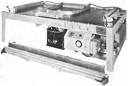 BANDING PRESS. - Press frame is of welded structural steel. Press is complete with hydraulic power unit controlled by hand knob to any pressure desired. Heavy duty transformer with three taps provides high, medium and low heat. In addition, heat cycle is controlled by interval timer and thermostat. Threaded holes through center of table permit hard wood center bar or fence to be mounted parallel to press length thus providing a double press to accommodate multiple loads of small panels on both sides of press in single heat cycle. Specifications: models available (dimensions indicate actual panel capacity): 48 x 74 in. (122 x 188 cm.) or 48 x 86 in. (122x 218 cm.) 48x 98 in. (122 x 250 cm.) 56 x 110 in. (142 x 280 cm.) all available with 3 in. (7.6 cm.) or 4 in. (10 cm.) high pusher shoes. Accessories include 16 ft. (4.9 m.) pull band, drawbar, dead brook with mounting bolts.