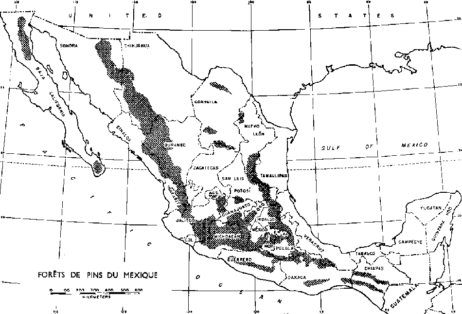 Les forêts de pins les plus importantes, tant par leur superficie que par le volume de leur matériel, se trouvent dans les états de Durango, de Chihuahua, de Michoacan, de Mexico, de Vera Cruz et de Coahuila.