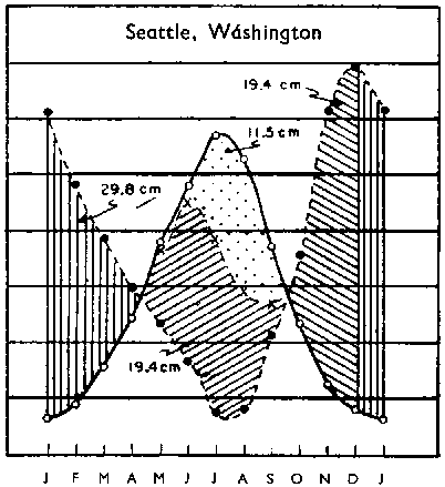Cuando se compara la evapotranspiración potencial con la precipitación, y tomando en cuenta el almacenamiento de agua en el suelo y su utilización ulterior, se percibe claramente que hay períodos de escasez y de exceso de humedad, lo cual permite conocer la humedad o aridez relativa de un clima. En algunas localidades, la precipitación siempre es mayor que. la evapotranspiración, de modo que el suelo permanece empapado y se obtiene un sobrante de agua, s. En otros lugares, mes tras mes, las precipitaciones son menores que la evapotranspiración potencial, la humedad resulta insuficiente para las necesidades de la vegetación y sobreviene un déficit de humedad, d. Por lo común, los puntos en que se registran temporadas de lluvias y de sequía o épocas de frío con escasas exigencias de agua presentan:,