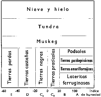 El factor humedad, y por ende el índice de humedad, adquieren importancia principal en las latitudes templadas y tropicales. En los bosques de coníferas económicamente valiosos de la región subártica, el elemento térmico parece superar la influencia de la humedad. En una serie de artículos recién publicados, Hare ha demostrado que las grandes subdivisiones fisionómicas del bosque boreal guardan correlación íntima con la distribución de la PE anual,2 y propone las divisiones que pueden verse en el Cuadro 5.