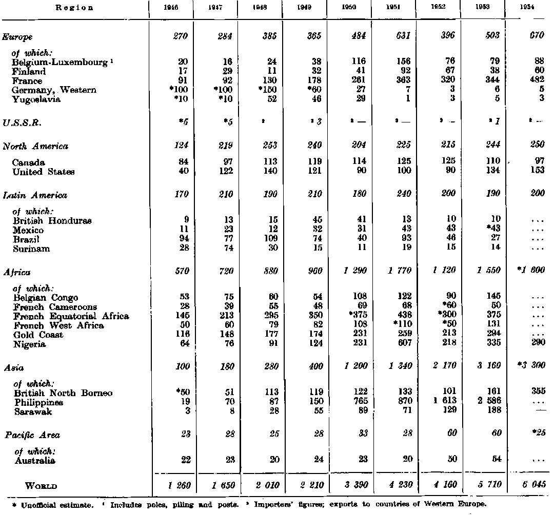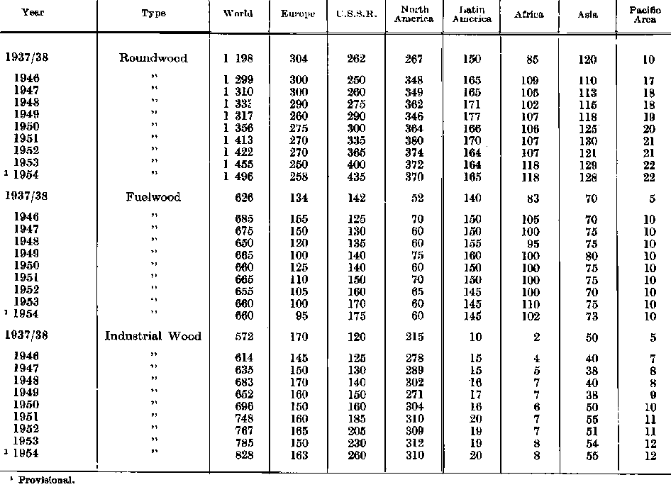 The record of timber felled over the past nine years in the FAO regions is shown in Table 1. In Europe, the level of total roundwood production immediately after the war considerably exceeded the volume warranted by traditional silvicultural practices. As economic conditions improved, fellings were gradually decreased to a level which seemed better to correspond to the sustained productive capacity of Europe's forests. At the same time, there was a spectacular fall in the volume of wood cut for fuel, from 155 million cubic meters in 1946 to only some 95 million cubic meters in 1954. Industrial roundwood cut rose by almost 12 percent during this period, from 145 million cubic meters to about 163 million cubic meters.