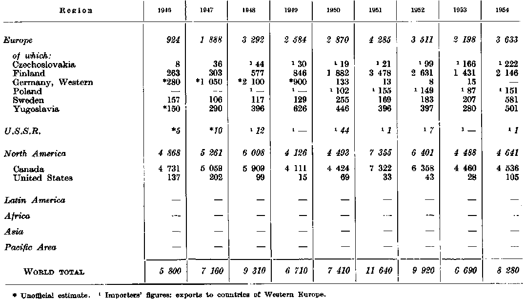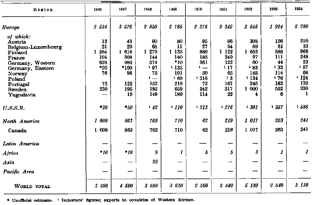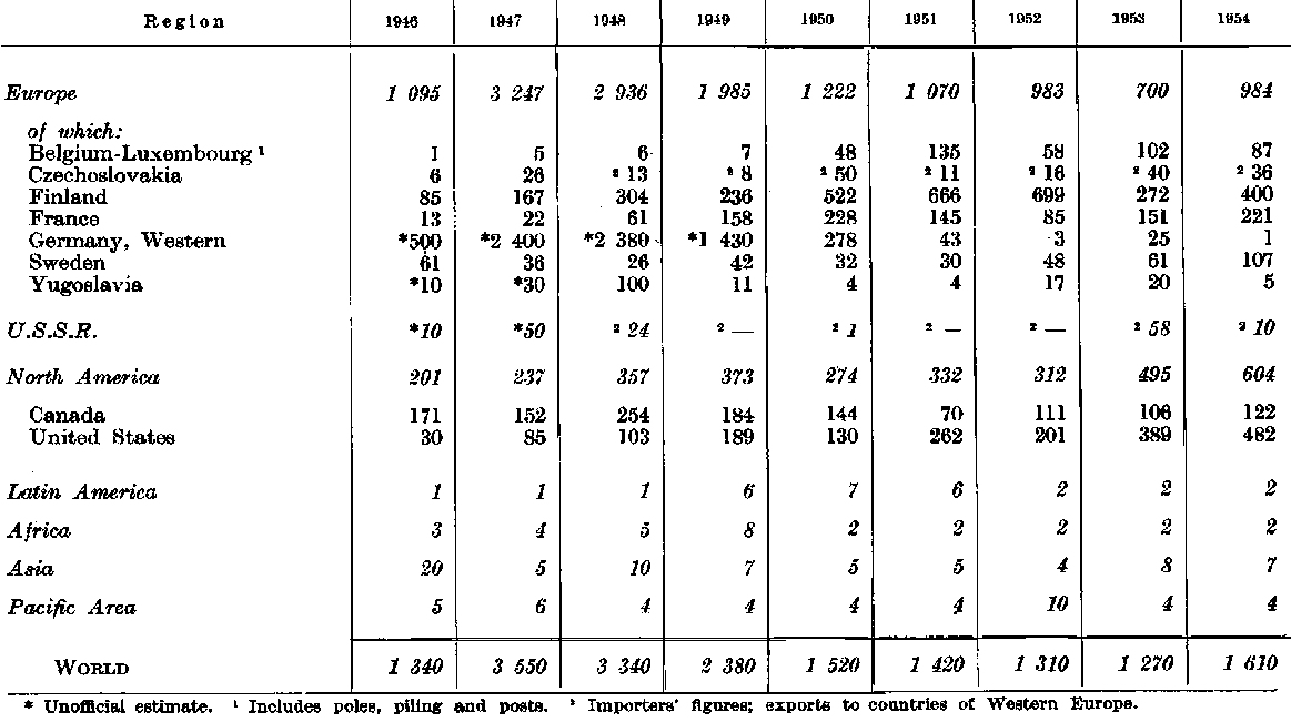 This European trade in industrial roundwood has varied between 3 and 6 percent of the total production in the region, the main categories concerned being pulpwood and pitprops. The volumes involved have amounted to about 10 to 15 percent of the region's total output of the commodities. The flow of trade in roundwood is mainly from the northern countries to the other parts of Europe. This reached its highest level in 1951 and 1952 when there was heavy buying by the main importing countries. Prewar these countries drew considerable supplies from the Soviet Union and Eastern European countries. Closure of this flow has since the war contributed to the pressure on export supplies available from northern Europe. Trade in pitprops and pulpwood has shown strong fluctuations but in 1954 pulpwood had increased by nearly 300 percent as against 1946, while pitprops had declined slightly. Trade in other round timber has remained more or less stable. It is in general limited to exchanges between contiguous countries, with the exception of imports of fine hardwood logs from other regions, a trade which has shown a considerable increase during the period being reviewed.