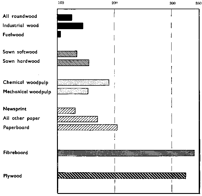 The diagram shows how the production of; the main wood-based commodities developed in the period under review. While removals of all industrial wood, as compared with the prewar level, rose by close to 50 percent, sawnwood production increased by some 40 percent, woodpulp and pulp products by about 70 percent, and fibreboard and plywood trebled. These figures reflect largely the changes in the industrial demand for roundwood as a raw material, although wood waste has been used increasingly for fibreboards.