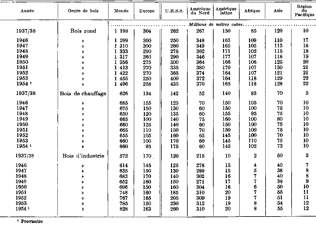 La production des forêts mondiales à ce moment est donnée par le tableau 1 qui donne aussi les exploitations totales de bois rond enregistrées de 1946 à 1954, et les compare à leur niveau d'avant-guerre (1937/38). L'augmentation progressive en volume de la production de bois, de près de 1300 millions de mètres cubes en 1946 à environ 1500 millions (augmentation de 15 %) reflète principalement un plus grand débouché du bois vers des usages industriels, de 614 millions de mètres cubes à 828 millions, soit 35 pour cent en plus. La production relative de bois de chauffage tendait à diminuer, de sorte que celle du bois d'industrie représentait une part accrue du total des exploitations. Elle était de 48 pour cent avant guerre, puis elle tomba à 47 pour cent en 1946 par suite d'une grande demande de bois comme combustible, mais elle était de 51 pour cent en 1950 et de 55 pour cent en 1954.