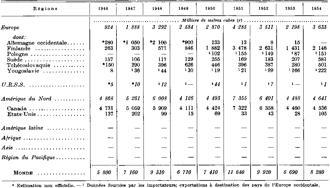 Dans les autres régions du monde, le volume du commerce des bois ronds reste à peu près insignifiant, excepté entre pays voisins, comme en Europe. Il y a eu une augmentation des exportations de bois à pâte du Canada vers les Etats-Unis, mais le volume des exportations des bois de mine de l'Amérique du Nord vers l'Europe a diminué. Le commerce des grumes de bois dur des Philippines vers le Japon a montré de remarquables augmentations en année. L'U.R.S.S. n'a pas repris ses exportations de bois à pâte, et est, en fait, devenu importateur de ce produit. Les exportations de bois de mine n'ont été reprises que lentement et sur une échelle beaucoup plus faible qu'avant-guerre.