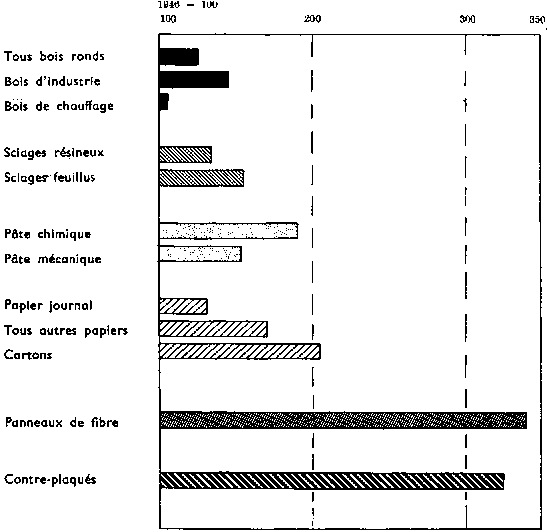 Le diagramme montre comment la production des principaux produits issus du bois s'est développée pendant la période en question. Tandis que les exploitations totales en bois d'industrie, comparées au niveau d'avant-guerre, s'élevaient de près de 50 pour cent, la production de bois de sciage augmentait de 40 pour cent, la pâte à papier et ses dérivés d'environ 70 pour cent, et les panneaux de fibre et le contreplaqué triplaient. Ces chiffres reflètent largement les changements dans la demande industrielle de bois rond comme matière première, bien qu'il faille prendre en considération le fait que les déchets de bois ont été de plus en plus utilisés pour les panneaux de fibre.