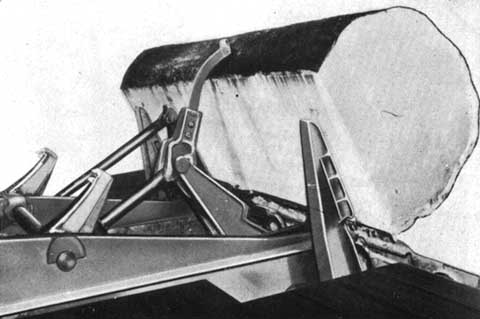TOURNE GRUME. - Utilisé en combinaison avec des béquilles de levage. Quand celles-ci sont soulevées au moyen de leur vérin, leur extrémité supérieure et antérieure dépasse de plus de 1 inch (2,5 cm) le dessus du châssis du chariot, ce qui forme point d'appui pour tourner la grume quand elle est tirée en arrière par le crochet tourne-grume. Ce crochet s'enfonce dans la grume sous l'action d'un vérin situé dans le bras qui porte le crochet et dont l'action peut être inversée. En tirant en arrière on amène la grume contre le talon constitué par les béquilles, on la tourne et on expose une nouvelle surface à la scie. Le crochet tourne-grume joue librement autour de l'arbre de commande général mais, dans sa course supérieure, il enclanche un embrayage à machoires claveté sur l'arbre, ce qui fait lever la béquille à vérin et les bras de manoeuvre et les met en position de tenir la grume pendant qu'elle tourne. La grosseur des grumes manipulées dépend de l'ouverture du chariot. Des cylindres de 10, 12 et 14 inches (25, 30, 36 cm) sont recommandés pour des chariots à ouvertures de 60/72, 72/84 et plus de 84 inches (1,5 à 1,8 m; 1,8 à 2,1 m; plus de 2,1 m).