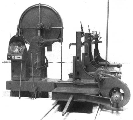 SCIE A RUBAN MODÈLE ADW. - Pour le débit des bois en grumes, avec chariot diviseur à griffage rapide et division à commande électrique par télédiviseur. Caractéristiques: Diamètre des volants, 1,1 m; largeur des volants, 100 mm, hauteur max sous le guide, 1,02 m, longueur max des lames, 7,3 m, vitesse de sciage 2,25 à 30 m/min; vitesse de retour, 47 m/min; embrayage à friction travaillant dans l'huile; dispositif de protection de la lame; chariot de 6 m avec 4 griffes pour scier 7 m.