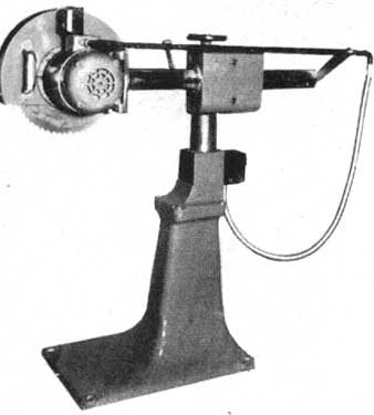 SCIE CIRCULAIRE POUR TRAITS DE SCIE EN TRAVERS. - Machine légère pour ébénisterie, menuiserie, industrie du jouet et de la caisse d'emballage. Peut être utilisée pour coupe simple ou confection de biseau composé, rainurage, entaille à mi-bois, assemblage, tenonage, moulurage et chanfreinage. Caractéristiques: Diamètre de la soie 12 inches (30 cm); nombre de t/min de la soie: 2800 à 50 périodes; longueur du trait 16 inches (41 cm); profondeur de coupe: 4 inches (10 cm); angle de rotation du bras pivotant 45° à dr. ou à g., soit une rotation de 90° dans plan horizontal.