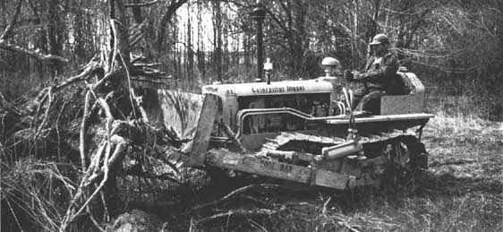 The bulldozer is the standard machine for the removal of brush and trees. It is a tractor equipped with a heavy pusher blade in front, which can be raised or lowered by hydraulic or cable control (Figure 8). The blade has a high concave moldboard with its bottom edge fitted with a steel-hardened, knife-like member which projects out ahead of the blade. The manner in which the blade is hinged to the pusher arms and lift rods differs in the many commercial models. Although the dozer blade is usually associated with a crawler-type tractor, blades fitting most wheel-tractors are available (24). 1