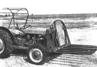 "A"-rail (Figure 27). As the name indicates, the "A"-rail has an A-shaped frame made of welded railroad rails which is pulled with the apex forward. Not evident in the photograph are two rolling coulters attached to the side rails at or near the position of the extremities of the crossbeam. These cut through debris which tends to accumulate in the angles made by the crossbeam and complement the rail in rolling over the vegetal material instead of dragging it along.