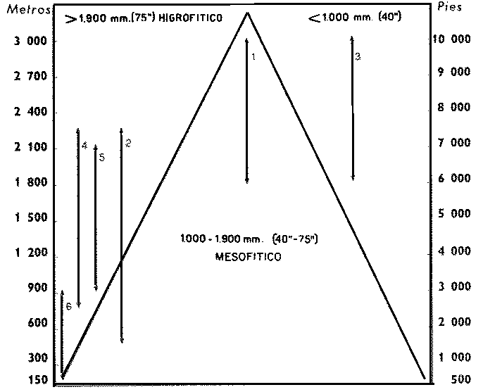 1. Zonas con más de 1.900 mm. (75 pulgadas) o de montes higrofíticos.2. Zonas con 1.000 a 1.900 mm. (40-75 pulgadas) o de montes mesolíticos.