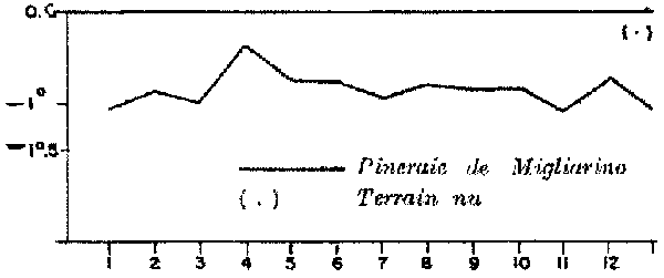 La pineraie de Cecina se comporte de la même façon; elle tend à abaisser constamment la température; il faut cependant noter ici un autre fait: au printemps et en été, la température à l'intérieur de la forêt s'élève de la même façon que la température extérieure; cela tient au fait que l'activité de la transpiration a été ralentie par la sécheresse. En automne, la courbe des minima est nettement plus basse; cela correspond au renouveau d'activité végétative déclenché par les pluies d'automne.