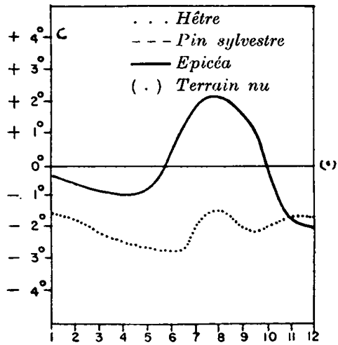 FIG. 1.C. - Comparaison de la température moyenne mensuelle de l'air en forêt et en terrain nu; celle-ci est représentée par une ligne horizontale. (D'après Schubert)