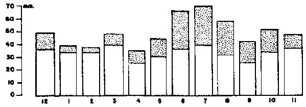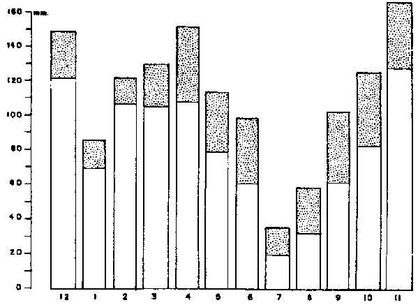 Ce fait est souligné par les diagrammes (fig. 3) qui donnent la répartition mensuelle de l'interception par rapport à la répartition de la pluviosité dans les hêtraies à Vallombrosa et à Berlin. Si nous supposons que les pouvoirs d'interception sont égaux, les hêtraies de Berlin interceptent 100 millimètres et laissent passer 131 millimètres sur une pluviosité totale de 231 millimètres pour les mois de juillet, août et septembre. Cependant, pour le mois de novembre, nous trouvons que sur une pluviosité mensuelle de 47 millimètres, 36 passent et 11 seulement sont interceptés tandis qu'à Vallombrosa il en passe 124 sur 161.