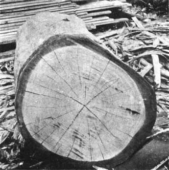 Dans une faible proportion seulement des grumes examinées, les tensions internes furent assez fortes pour provoquer des éclatements aux extrémités, aussitôt après abattage des arbres ou découpe des grumes. La fréquence de ces accidents fut du même ordre que celle enregistrée en Australie.