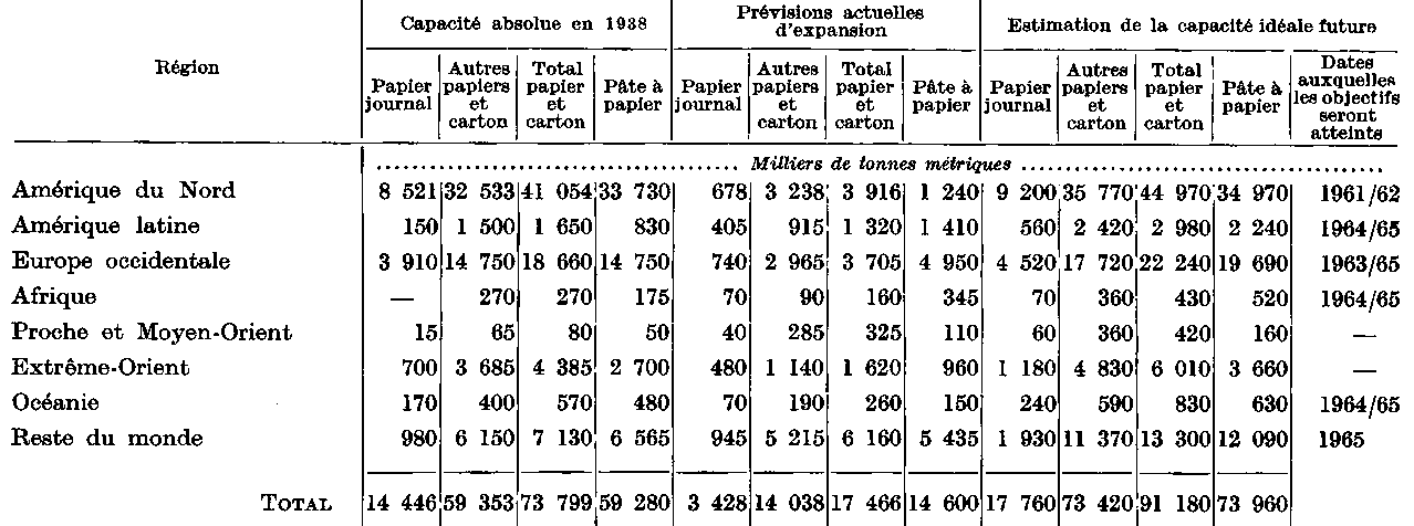 Si un accroissement supplémentaire de la capacité de production de papier et de carton n'intervient pas en Amérique du Nord d'ici 1965, ces deux secteurs de l'industrie travailleront alors à plein rendement; d'un autre côté, si l'on veut disposer d'une réserve de capacité de 5 % il faudra augmenter la capacité de production de papier journal de 520 000 tonnes, et celle des autres secteurs de 1,75 millions de tonnes. Pour la pâte à papier, la satisfaction des besoins supplémentaires évoqués dépend d'un certain nombre de conditions, en particulier de la possibilité de consacrer une part importante de la capacité de production de pâte textile à la fabrication de pâte à papier. En Europe occidentale, les possibilités d'expansion de l'industrie de la pâte à papier semblent actuellement faibles, et celles de la papeterie et de la cartonnerie limitées. Par ailleurs, il est possible que des modifications de la technique de fabrication permettent d'augmenter les capacités actuelles.