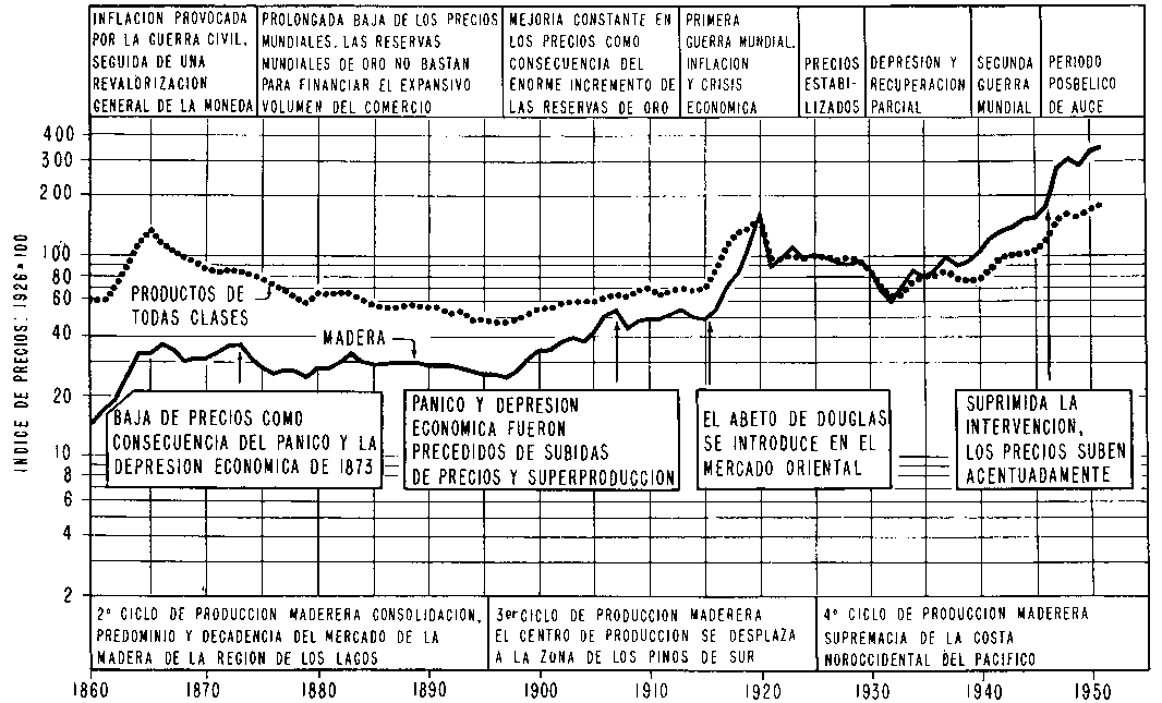 En un esfuerzo para convencerse de las perspectivas financieras que ofrecen a largo plazo los montes de especies exóticas de Nueva Zelandia como fuente proveedora del mercado maderero internacional, el autor de este informe dispuso que en el período inmediato de posguerra se procediera a un estudio de las tendencias a largo plazo de los precios de la madera, en relación con el movimiento general de precios. Deseaba así comprobar la teoría de que, como a medida que las regiones forestales se explotaban y agotaban una tras otra, las existencias vírgenes de madera de coníferas de alta calidad iban quedando cada vez más remotas, los precios de la madera tenían forzosamente que subir en relación con los precios generales.
