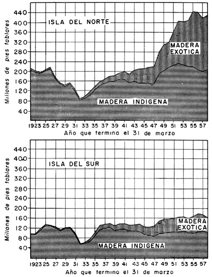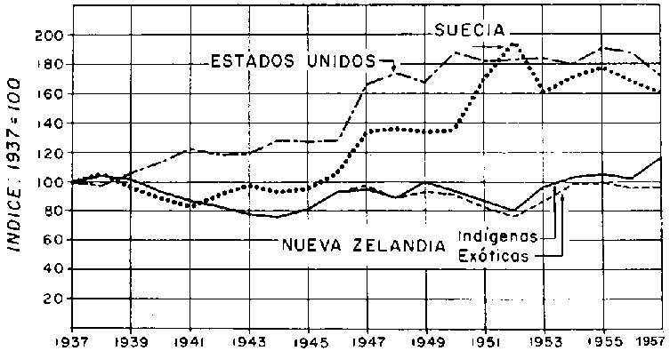 NUEVA ZELANDIA ofrece un ejemplo clásico de una economía forestal en vías de desarrollo. Y es otro ejemplo, igualmente clásico, de la influencia de los precios sobre los tratamientos silvícolas. Si bien la dilapidación de los recursos de sus selvas vírgenes fue un fenómeno típico de la colonización, los remedios intentados al plantar en gran escala especies exóticas de crecimiento rápido se salen por completo de lo normal. Las plantaciones de cada especie no se distribuían más o menos uniformemente en turnos previstos, sino que todas ellas estaban concentradas en breves períodos, que representaban del 5 al 20 por ciento de aquellos turnos. Apenas se habían establecido cuando estalló la segunda guerra mundial, creando tal escasez de mano de obra, que precisamente cuando los tratamientos silvícolas se hacían más necesarios, no se pudo hacer nada. Esta situación se prolongó hasta bien entrada la posguerra.