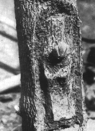 Sobre el patrón se practican dos incisiones verticales formando arco en punta. La lengüeta de corteza que resulta se levanta por el punto donde ambas incisiones se unen, dejando al aire el cambium del patrón (véase la Figura 1). Una placa rectangular de corteza con una yema del árbol seleccionado se coloca sobre el cambium expuesto y se cubre con la lengüeta de corteza de] patrón apretándola bien. Se cubre la unión con un trozo rectangular de hoja de palma que se liga fuertemente al patrón de abajo a arriba.