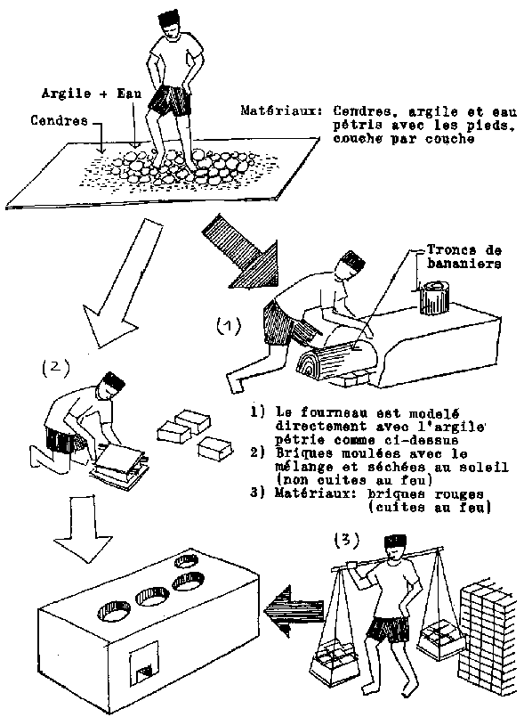 Les fourneaux de type traditionnel durent à peine une année. C'est pourquoi nous avons accordé une attention particulière à la question du matériau et entrepris divers essais en vue d'assurer aux nouveaux modèles une plus grande longévité. Comme matière de base, nous avons choisi la glaise à l'état cuit, séché ou humide. Pour renforcer la glaise, ou peut mélanger de la sciure de bois, des cosses de riz, de la paille de riz ou des cendres. Trois méthodes de construction ont été choisies: briques cuites, briques séchées et glaise. Elles sont représentées dans l'annexe 17.