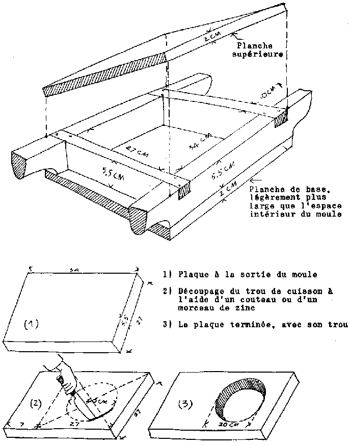 La partie la plus difficile du montage, c'est le façonnage de la plaque avec ses trois trous et la sortie de fumée. Le procédé le plus simple consiste à préparer trois plaques pour chaque fourneau. Ces plaques se fabriquent avec la même matière que les briques et sont moulées dans une forme. Avant de les cuire, on les laisse sécher légèrement jusqu'à ce qu'elles aient pris une certaine rigidité permettant de découper le trou qui recevra la marmite. La figure 2 reproduit la forme et les dimensions d'une telle plaque. Il est aussi possible, mais un peu plus difficile, de fabriquer la plaque de cuisson avec des briques normales. Ces briques doivent être ajustées très exactement et bien maçonnées. Afin que les trous de cuisson soient disposés convenablement, il est avantageux d'utiliser une forme ronde en bois, de 20 cm de diamètre. Indépendamment de leur durabilité, les briques offrent encore l'avantage de permettre d'utiliser le fourneau après trois ou quatre jours de séchage seulement.