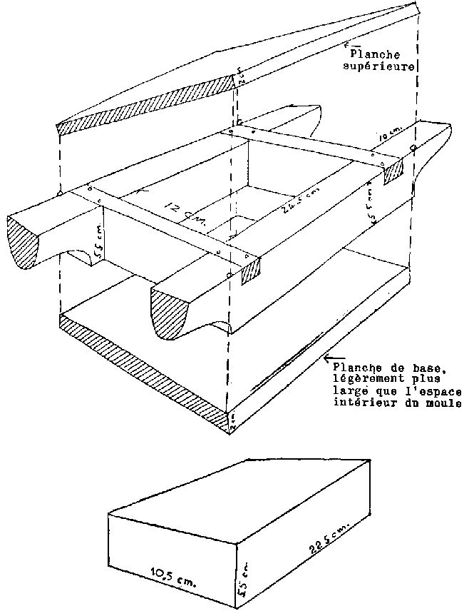 La deuxième méthode consiste à utiliser uniquement des briques séchées. Celles-ci se fabriquent de la même façon que les briques cuites, mais sont simplement séchées au soleil. Le montage du fourneau se fait comme dans la première méthode. A l'usage de mortier, on utilise de la glaise mélangée avec 40 % de sciure de bois et 10 % de cendres. On trouvera dans la figure 3 la forme et les dimensions de ces briques. Il est recommandé de saupoudrer le moule de cendres sèches avant d'y verser la matière.