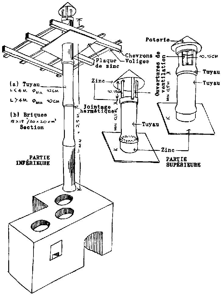 Quelle que soit la méthode appliquée, la cheminée doit être faite de tuyaux d'argile cuits ou de briques cuites. Dans la figure 4, on trouvera figurés la construction et la disposition, ainsi que le passage à travers le toit.