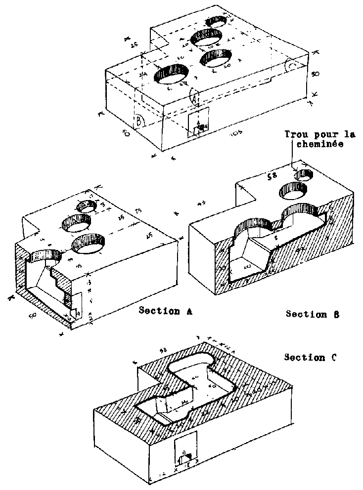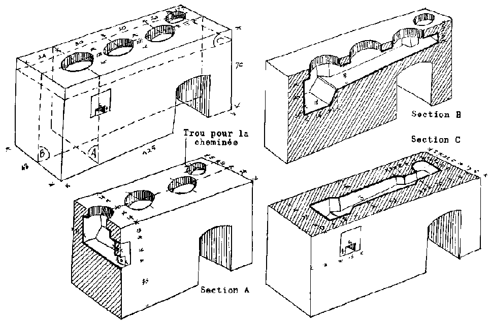 Après examen des modèles existants et des usages culinaires, il apparut désirable de créer un troisième modèle à deux trous, destiné aux petites familles. Il présente les mêmes caractéristiques que les deux autres modèles, c'est-à-dire qu'il possède un foyer fermé, un carneau et une cheminée. Le foyer est disposé parallèlement aux trous de cuisson; mais il peut aussi être perpendiculaire comme dans les deux autres modèles. Pour le fourneau à un trou, composé simplement de trois pierres, il n'est pas possible d'y apporter une transformation fondamentale. Il faut se contenter d'améliorer ce qui existe. La construction est en principe la même, mais on emploie des briques. La face antérieure est fermée au-dessus de l'ouverture d'allumage, ce qui permet d'obtenir une bonne concentration des flammes contre la marmite. Ce modèle est représenté dans la figure 15.