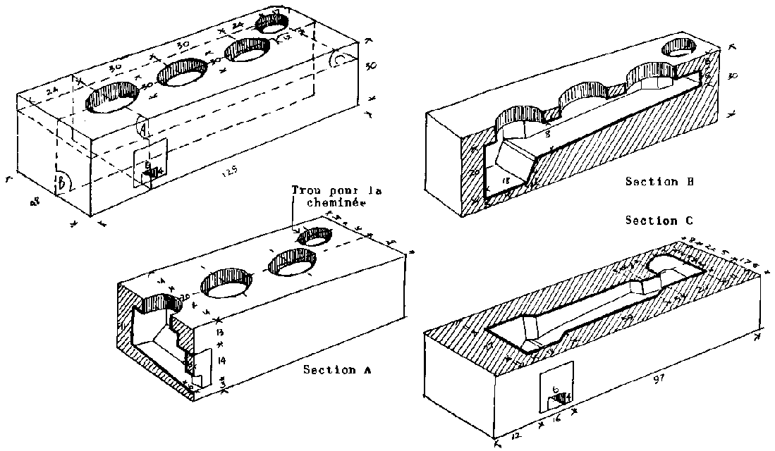 Le foyer remplit les fonctions suivantes: recevoir la quantité de bois nécessaire, procurer à la flamme l'espace nécessaire à son développement, rassembler les braises en un amas compact et assurer une combustion concentrée. Il n'est pas possible de donner des dimensions précises qui soient valables pour tous les cas. Dans les modèles considérés, le foyer a une longueur de 27 à 28 cm, une largeur de 16 à 18 cm à la partie inférieure et 18 à 20 cm à la partie supérieure. La hauteur intérieure devrait être de 20 cm. Il importe surtout que le foyer soit complètement fermé. L'ouverture de charge s'obture au moyen d'une pierre, dont la partie inférieure est pourvue d'un orifice de 6 sur 4 cm pour l'introduction de l'air comburant.