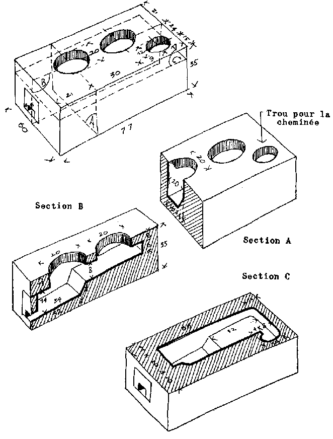 On commence par construire un socle ayant la même base que le fourneau. Pour ménager l'espace libre nécessaire au foyer et aux carneaux de tirage, il faut utiliser des formes, par exemple un bout de tronc de bananier (voir figure 1). On n'enlèvera pas les formes avant que la matière soit assez sèche. On façonne ensuite la partie intérieure conformément aux cotes du dessin.